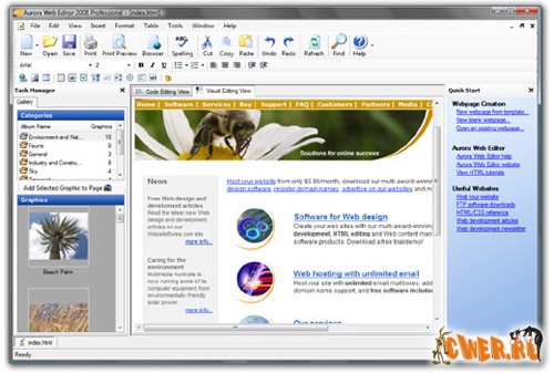 Aurora Web Editor 2008 Professional - это 2-в-1 профессиональный построитель сайтов, так как имеет два востребованных режима работы: Visual Editor - конструктор WYSIWYG (What You See Is What You Get - что вижу-то и получаю) для новичков, не знакомых с HTML, и Code Editor - для тех веб-разработчиков, которые предпочитают кодировать веб-страницы вручную. Для них Aurora Web Editor предлагает функциональную среду разработки HTML кода (подсказки по HTML включены в программу). Программа имеет для полноценной работы более 100 встроенных шаблонов, картинок и фотографий. С помощью этого редактора Вы создадите веб-сайт быстро и легко, добавляя текст, картинки и ссылки, меняя размеры и позиции так же просто, как если бы Вы работали в обычном текстовом редакторе.