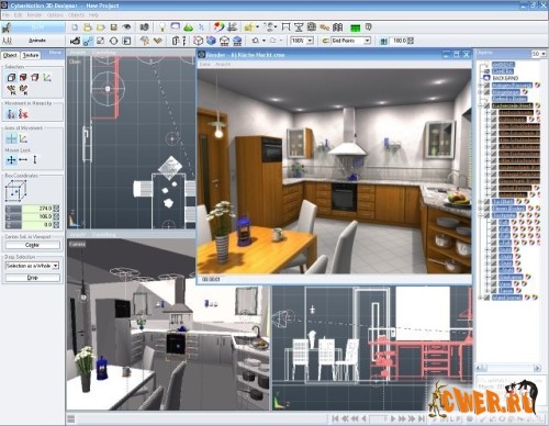 Пакет профессионального уровня для моделирования, создания анимации и рендеринга 3D моделей. Особенностью 3D-Designer является огромное количество шаблонов и подсказок, с помощью которых даже новичок в обьемном моделировании запросто сможет построить, к примеру, комнату и заполнить ее мебелью. Построение трехмерных изображений выполняется при помощи чертежей (наверняка ведь каждый делал чертежи на уроках черчения): создав три чертежа - вид сверху, сбоку и спереди, можно получить в этой программе готовый 3D-объект. Конечно же, с помощью CyberMotion 3D-Designer можно выполнять не только моделирование квартир, но и любое другое 3d-моделирование и высококачественную анимацию, чему в немалой степени способствует удобный пользовательский интерфейс и многочисленные объединенные в одну среду инструменты.