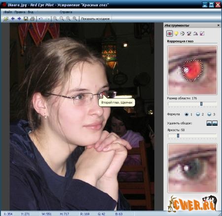 Для удаления нежелательного эффекта достаточно совершить два действия: 1. Щелкнуть на левом глазе 2. Щелкнуть на правом глазе Программа позволяет регулировать область обработки и яркость цвета глаз. Имеется окно предварительного просмотра. После установки можно посмотреть демонстрационный пример.