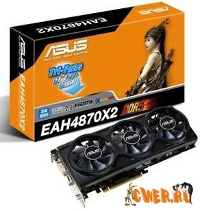 Двухчиповая видеокарта Asus EAH4870X2/HTDI/2G оснащается уникальным кулером с тремя вентиляторами, который обеспечивает снижение температуры видеочипа на 24 градуса Цельсия по сравнению с системой охлаждения эталонного дизайна. Уровень шума при этом не превышает 29 дБ. Производитель также гордится качественной элементной базой и экранирующей системой, которые позволяют снизить температуру силовых элементов и уровень электромагнитных наводок.