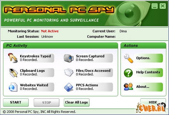 Personal PC Spy является мощным средством слежения, которое работает совсем незаметно и может захватывать и сохранять все нажатия клавиш, включая набор имени пользователя и пароля при входе в Windows. Personal PC Spy может также захватывать текст из активного окна, текст, набираемый в популярных интернет-пейджерах, включая AOL, Yahoo!, ICQ, MSN и AIM. Программа захватывает ко всему прочему адреса сайтов, посещенных на вашем компьютере, весь текст, скопированный в буфер обмена. Personal PC Spy работает совершенно незаметно и настолько скрытно, что и компьютерные специалисты с опытом не смогут обнаружить работу утилиты.