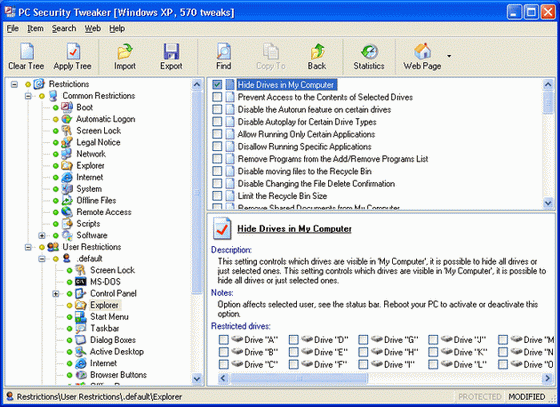 Программа PC Security Tweaker может быть применена для улучшения работы операционной системы Windows. Эта программа может работать со всеми версиями Windows. Вы можете улучшить доступ к Панели управления, включая такие команды как Показ, Сеть, Пароли, Принтер, Система, Добавить/ Удалить программу и многое другое. Программа может предложить для каждого пользователя отдельную пользовательскую систему (интерфейс), которая будет включать свой Рабочий стол, Меню, Мои документы.