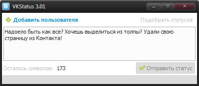 VKStatus - бесплатная программа, представляющая собой каталог статусов для контакта и утилиту управления статусами в контакте. Содержит более 9000 различных статусов, разбитых на категории "Любовь", "Разлука", "Юмор", "Депрессия", "Умные мысли", "Для девушек", "Для парней", "Секс" и т.д.