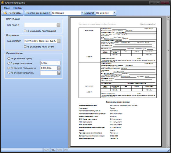 Программа ЮристГоспошлина предназначена для расчета госпошлины, подготовки документов на уплату госпошлины и печати подготовленных документов.