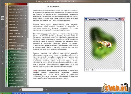 Каждый урок сопровождается в ней флэш-роликом, что позволяет любителям видео при просмотре иногда поглядывать в текст, а книголюбам сверяться при чтении с видео-иллюстрацией. Схватываете всё на лету и хотите выучить Фотошоп за три часа? Разверните ролики во весь экран и смотрите в режиме нон-стоп как один полнометражный фильм.