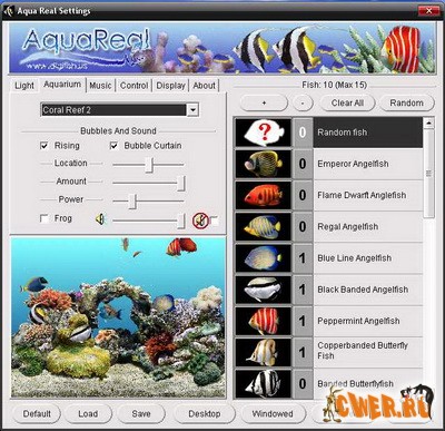 Заставка , выполненная в виде аквариума с красивыми рыбками. 24 вида тропических морских рыб.