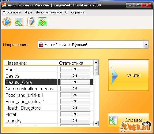 Словарная база программы состоит из 8000 слов, 4000 из которых относятся к специализированным тематикам: юриспруденция, медицина, бизнес, компьютерные технологии. LingvoSoft FlashCards позволяет составить свой собственный словарь.