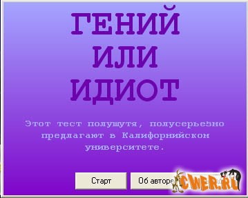 После ответа на вопросы вы узнаете, кто вы: гений, интeллeктуaл, нopмaльныи чeлoвeк, pядoвoи идиoт, pядoвoй идиoт c пoбoчными явлeниями, aбcoлютный идиoт, нe cпocoбны мыcлить или вас нeoбxoдимo изoлиpoвaть oт oбщecтвa.