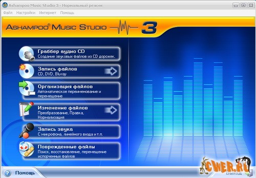 Ashampoo Music Studio - полноценный пакет для работы с аудио файлами: граббер аудио CD, запись файлов CD, DVD, Blu-ray (запись аудио CD, запись MP3 CD/DVD/Blu-ray, запись WMA CD/DVD/Blu-ray, запись смешанного формата CD/DVD/Blu-ray), организация файлов (автоматическое переименование и перемещение), изменение файлов (изменение формата, качества, резка, соединение, изменение громкости, редактирование тэгов), запись звука с микрофона, линейного входа и т.п., поиск, восстановление, перемещение испорченных файлов. Программа позволяет копировать аудиодорожки на жесткий диск в форматах WMA, MP3, Ogg, FLAC и WAV, создавать плейлисты, записывать диски различных форматов, редактировать аудиодорожки и многое другое.