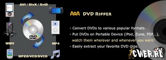 AoA DVD Ripper - программа для быстрого и эффективного создания копий DVD-фильмов. AoA DVD Ripper обладает простым интерфейсом, высоким качеством создаваемых копий, высоким быстродействием, возможностью пакетной обработки файлов и другими полезными возможностями. Позволяет записать на жесткий диск компьютера фильмы в форматах AVI (DivX, XviD...), VCD (MPEG-1) и SVCD (MPEG-2), а также извлекать звуковые дорожки в отдельные файлы.