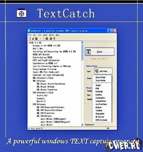 При захвате изображения экрана, пользователь как правило получает результат в виде графического файла. Когда необходимо выполнить захват текста с возможностью последующего редактирования, TextCatch поможет решить данную задачу. С ее помощью можно выполнять захват текста практически с любых элементов интерфейса других приложений, в том числе с кнопок, информационных и диалоговых окон, панелей инструментов и т. д. Кроме того, TextCatch удобно использовать для копирования списков файлов и папок, например, в окне менеджера файлов.