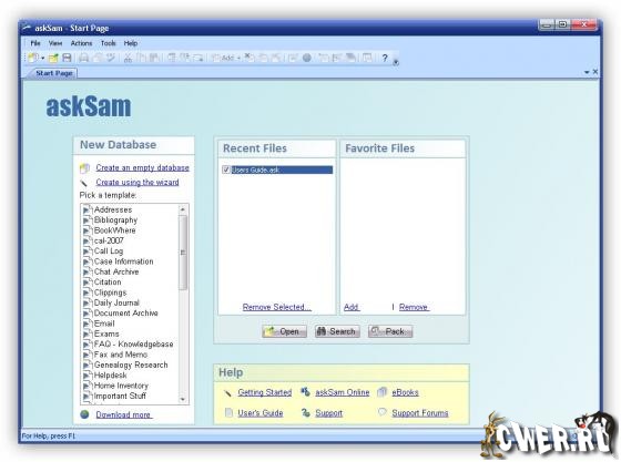 AskSam Pro - программа является свободно-конфигурируемой базой данных, с помощью которой можно организовать управление большим количеством документов. Легко позволит вам внести в базу все что угодно - электронные письма, документы, текстовые файлы, таблицы, разнообразные платежные поручения, отчеты за определенный период, адреса клиентов, веб-страницы и многое другое. Также позволяет производить поиск по всем введенным данным. Программа является идеальным приложением для организации и хранения вашей информации и данных. Нет никакой необходимости знания языков программирования. Позволяет получить всю полноту власти над своей базой данных не испытывая при этом никакой сложности.