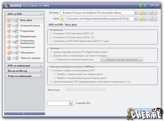 - 8 режимов копирования DVD на DVD:полный диск,основной фильм,разделение,переделывание,разделение по своему определению,клон,объединение и писать данные.