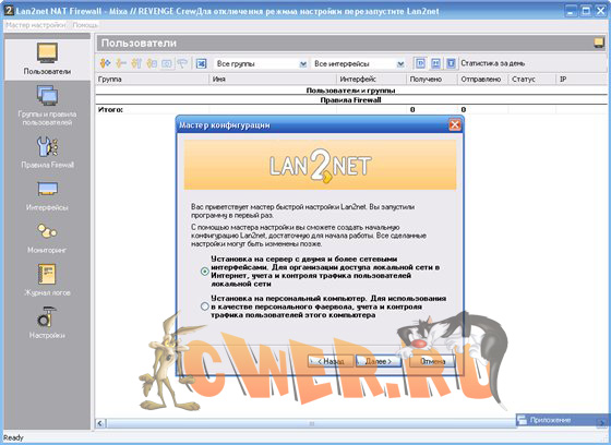 Lan2Net Nat Firewall - российская разработка программного файрвола для подключения интернета к локальной сети компании. Полная защита сети от атак, точный учет трафика пользователей и гибкая фильтрация сайтов. Lan2net NAT Firewall является идеальным решением для настройки Интернета, обеспечения безопасности локальной сети и контроля трафика небольших и средних по размеру локальных сетей. Набор необходимых функций, простота настройки, понятный и удобный интерфейс на русском языке, высочайшая производительность, экономичность ресурсов и невысокая цена делают Lan2net NAT Firewall наиболее выгодным решением для вашей сети. Интерфейс программы доступен только на русском языке.