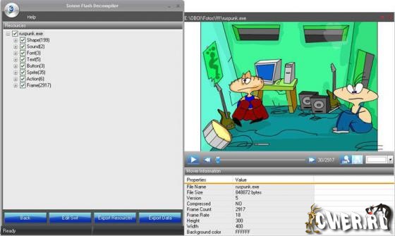 Мощная программа для флеш, позволяющая преобразовывать файлы между форматами SWF и EXE, а также позволяющая редактировать ролики в формате SWF. С помощью данной программы вы сможете редактировать текст, шрифты, картинки, звуки, формы, сценарии и другие элементы, находящиеся в флеш - файле.