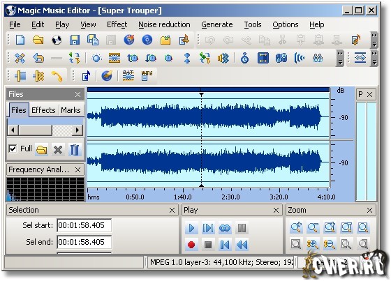 Magic Music Editor - отличный редактор аудио файлов. Особенности: запись аудио сигналов с любого источника, редактирование, микширование аудио сигналов, поддержка WAV, MP3, MP2, WMA, Ogg Vorbis, AIFF, MPC и других аудио форматов, наложение фильтров и эффектов (Amplify, Delay, Equalizer, Fade, Flanger, Invert, Normalize, Reverse, Silence, Stretch, Vibrato, Echo, BandPassFilter, FFTFilter, HighPassFilter, HighShelfFilter, LowPassFilter, LowShelfFilter, NotchFilter), простота в обращении, конвертирование аудио между форматами, высокое качество.