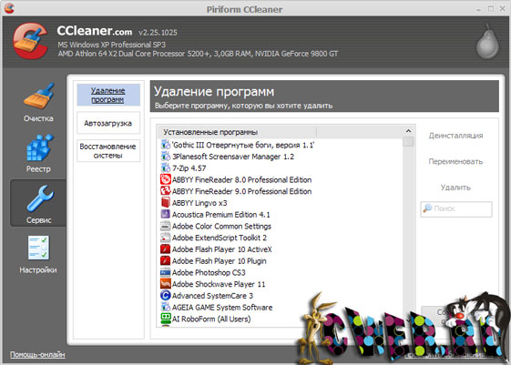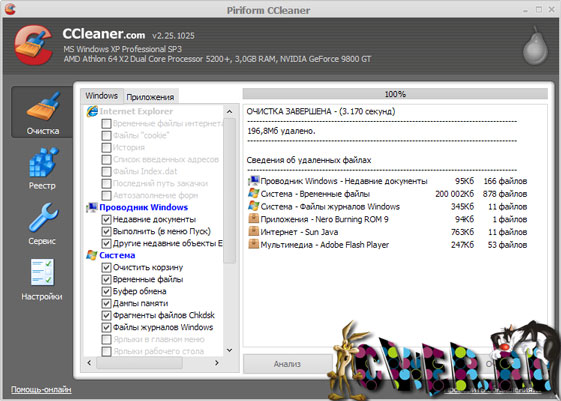 Кроме чистки Windows, CCleaner также умеет проводить удаление временных и др. ненужных файлов многих других программ, включая: Firefox, Opera, Media Player, eMule, Kazaa, Google Toolbar, Netscape, Office XP, Nero, Adobe Acrobat, WinRAR, WinAce, WinZip и др...
