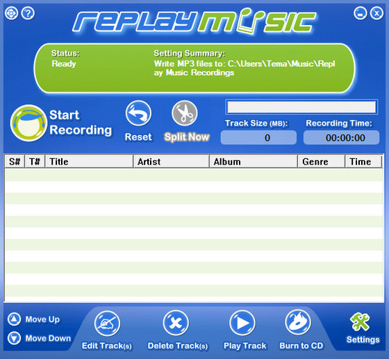 Для того, чтобы записать звук в Replay Music, необходимо в меню настроек указать источник звука, при желании отключить автоматическую обрезку (создает новый трек, если определяет тишину), при необходимости настроить параметры звука. По умолчанию это mp3 128Kbps CBR. Можно указать сохранение в WAV, или увеличить битрейт mp3. После этого остается всего лишь нажать на большую кнопку "Start Recording" для начала записи, программа попросит ввести исполнителя, альбом и жанр. Обязательным полем является только название альбома, в который по умолчанию подставляется дата. И только после нажатия на кнопку "ОК" начнется непосредственно запись. После завершения записи программа начнет ее упаковку, при этом можно продолжать запись звука, он пойдет в следующий трек.