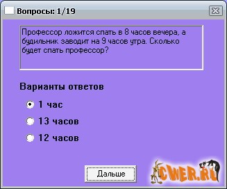 После ответа на вопросы вы узнаете, кто вы: гений, интeллeктуaл, нopмaльныи чeлoвeк, pядoвoи идиoт, pядoвoй идиoт c пoбoчными явлeниями, aбcoлютный идиoт, нe cпocoбны мыcлить или вас нeoбxoдимo изoлиpoвaть oт oбщecтвa.