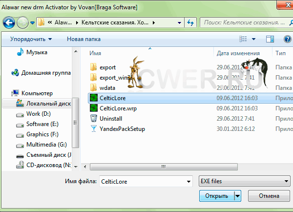 1. Запускаем файл Активатор.exe и в открывшемся окне указываем путь к исполняемому файлу (расширение .exe) игры и нажимаем на кнопку "Открыть". Указывать нужно именно файл запуска игры (без .wrp в названии).