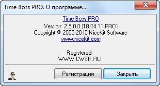 Во вкладке File/Свойства нажать Снять защату, для закрытия программы нажмите кн. Спрятать в меню трея, далее поместите файл time_boss.exe из архива crack.rar в папку с установленной программой и согласитесь на замену. Запустите программу, нажмите кн. О программе/Регистрация и зарегистрируйте любыми данными