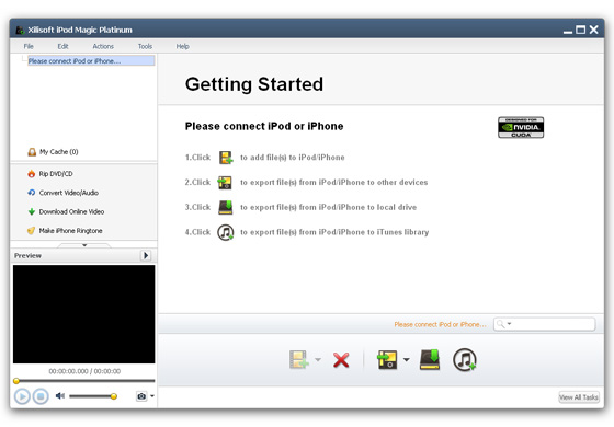 Xilisoft iPod Magic Platinum является все-в-одном IPod менеджер инструментов, который предоставляет большое удобство для вас при резервном копировании, управлении и передачи IPod/iPhone музыки, фильмов, фотографий, книг и iPhone рингтонов между IPod/iPhone и PC. Программа также позволяет производить рип CD/DVD в IPOD/iPhone музыку/фильмы, конвертировать различное аудио/видео, в форматы воспроизводимые на IPod/iPhone, резервное копирование всего IPod/iPhone контента в iTunes, загрузка и конвертирование онлайн видео для IPod/iPhone, создание iPhone рингтонов из мультимедийных файлов и т.д.