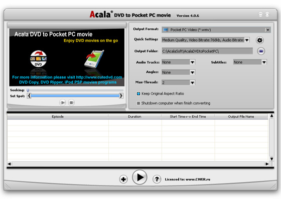 Acala DVD to Pocket PC movie - эта простая в использовании программа всего за один клик конвертирует ваши DVD-фильмы в MP4 (MPEG-4, H264) и WMV, для Pocket PC и других портативных мультимедийных плееров.