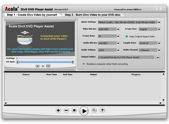 Acala DivX DVD Player Assist - это простая в использовании, но мощная программа для DivX авторинга, которая позволяет копировать и конвертировать все другие видеоформаты в DivX видеоформат. Он предназначен для тех, кто хочет наслаждаться фильмами из интернета или своим собственным видео на DVD-плеере. Вы можете сжимать более 10 фильмов в один DVD фильм и записывать его на DVD.