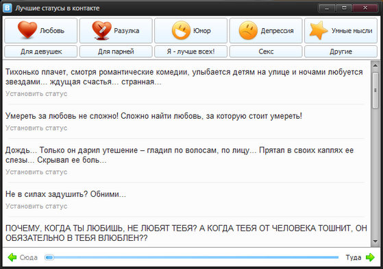 VKStatus - бесплатная программа, представляющая собой каталог статусов для контакта и утилиту управления статусами в контакте. Содержит более 9000 различных статусов, разбитых на категории "Любовь", "Разлука", "Юмор", "Депрессия", "Умные мысли", "Для девушек", "Для парней", "Секс" и т.д.