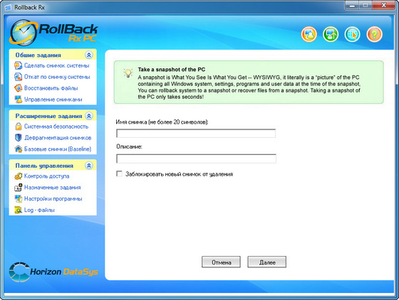 - Создание новых снимков вручную, автоматически или при исполнении файла.