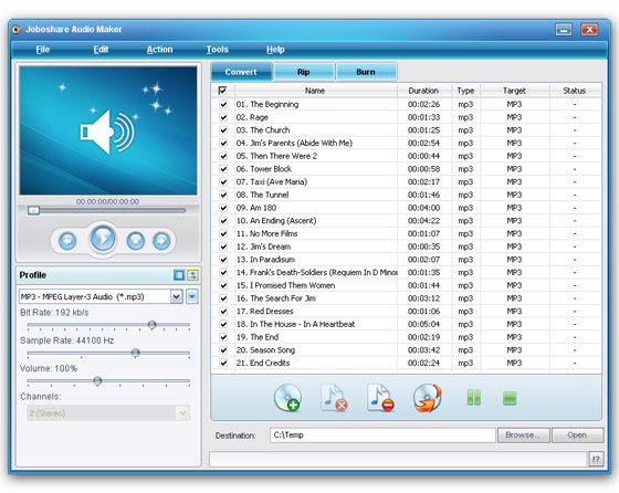 Joboshare Audio Maker простая в использовании программа, позволяющая создавать музыкальные CD из различных аудиоформатов (включая MP3, WMA, WAV, M4A, AAC, AC3, FLAC), риповать CD, извлекать аудио из видеофайлов (AVI, MPEG, WMV, MP4, 3GP, ASF, MOV, RM), записывать музыкальные CD (аудио CD, MP3 CD, и WMA CD) из видео/аудио файлов.