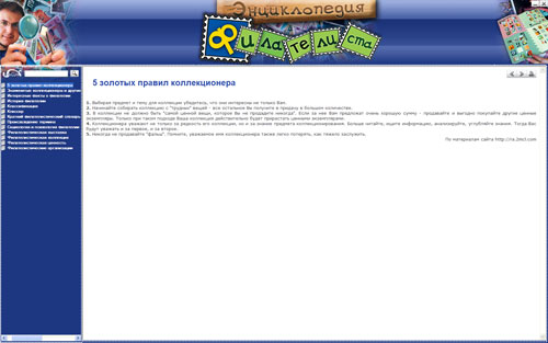 Коллекционирование почтовых марок – одно из самых массовых и демократичных увлечений. И если вам интересно все, что происходит в мире филателии, этот диск для вас. Программа расскажет о знаменитых коллекционерах, о редких марках и каталогах, познакомит с наиболее яркими событиями мировой филателии и т.д. Вы также узнаете о филателистических обществах в России и за рубежом, о газетах и журналах, публикующих последние новости филателии.