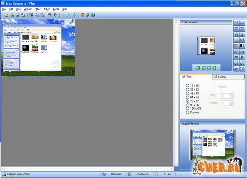 Может делать скриншоты экрана либо отдельных приложений и сохранять их как графический файл или иконку. Способность преобразовывать иконки в изображения и изображения в иконки в пакетном режиме со множеством эффектов фильтрации и различными образцами.