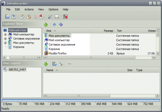 Infra Recorder - программа для записи данных на CD/DVD диски. Предоставляет пользователю возможность создания CD/DVD дисков с данными, музыкальных Audio CD и DVD видео дисков. Программа способна не только записывать данные непосредственно на диск, но и создавать ISO и BIN образы, а также использовать их в качестве промежуточной стадии при полном копировании диска на другой диск (в случае, наличия в системе только одного пишущего привода).