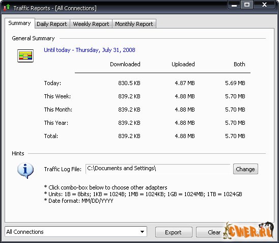 Bandwidth Meter Pro - это простая в использовании сетевая программа для слежения и подготовки отчетов о коэффициенте использования полосы частот. Программа следит за трафиком всех сетевых соединений на Вашем компьютере и отображает графическую и числовую скорость скачивания и загрузки в реальном времени. Программа записывает в журнал коэффициент использования полосы частот и выдаёт информацию о том, сколько полос частот было использовано каждым сетевым соединением на Вашем компьютере каждый день, неделю и месяц. Bandwidth Meter Pro работает со всеми типами сетевых соединений, включая модем, ISDN, DSL, ADSL, кабельный модем, беспроводные сетевые карты, карты Ethernet и другие.