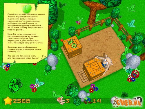 Эта игра — римейк популярной компьютерной головоломки Sokoban. Ее главный герой, фермер Джо, решил навести порядок в своем хозяйстве. В этом ему понадобится ваша помощь. Управляя Джо, осторожно передвигайте ящики, снопы сена и фляги для молока, ведь все они расположены таким образом, что действия необходимо продумывать на несколько ходов вперед.