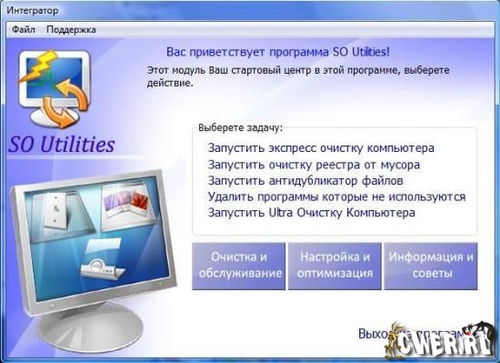 SO Utilities - бесплатный пакет утилит для настройки оптимизации и очистки компьютера от мусора на жестком диске и реестре. Это следующая версия программы SO Utilities, которая обладает более приятным интерфейсом улучшенными модулями и расширенными возможностями. В новой версии появился новый модуль быстрого исправления ошибок.