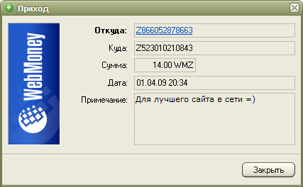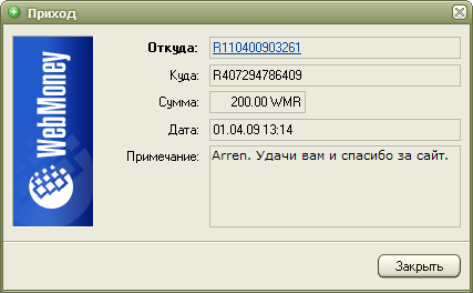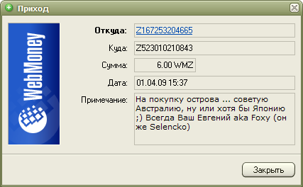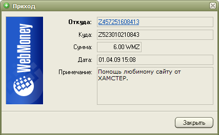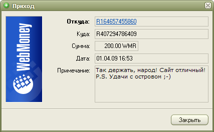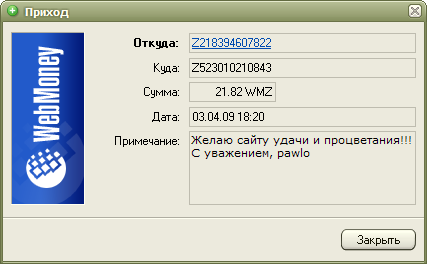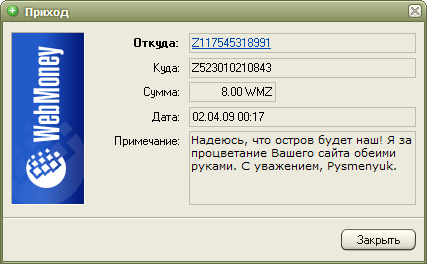 Мы надеемся на Вашу поддержку, ведь сейчас только от Вас зависит судьба портала и его администрации. Нам кажется, 6 долларов - не такая большая сумма, и мы верим, что Вам будет нетрудно с ними расстаться. Помочь сейчас можно только посредством системы WebMoney, реквизиты приведены на странице Помощь сайту. Быстрый вывод средств из других систем, к сожалению, для нас недоступен.