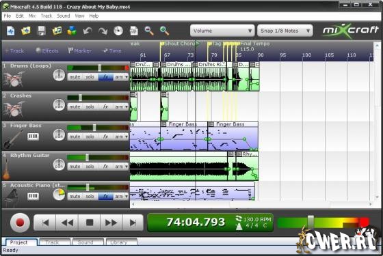 Acoustica Mixcraft - многодорожечное звуковое программное обеспечение с большим количеством эффектов (Переконверт, Задержка, Компрессор, Flanger и Хор), так же резонансные фильтры и мощной редактор дорожек. Высокая эффективность порадует вас, разгон 32 бита со студийным качеством, поддержка файлов WAV и даже импортируемых сжатых MP3, OGG, WMA файлов. Удобен для записи собственной музыки, к примеру, дорожек музыки или соединять разные файлы в один.