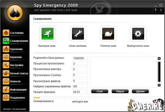 Spy Emergency 2009 - программное обеспечение, которое быстро и безопасно находит и удаляет шпионские модули, программы-рекламы и другие вредоносные программы из вашего компьютера. Вы боитесь хакеров или шпионские программы, тогда установите данную программу и будьте уверены, что вы защищены от вмешательства в ваши личные дела, связанные с компьютером. Программа сканирует системную память, реестр, отдельные директории, файлы кукисов в поиске вредоносных программ и шпионских модулей. Утилита в реальном времени анализирует и защищает память компьютера. Также программа имеет поддержку интернет-браузеров Internet Explorer, Mozilla Firefox, Opera, а также поддержку работы с операционной системой Windows Vista. Интерфейс программы ненавязчив и прост, а функциональность и быстродействие программы просто поражают воображение. Имеется мультиязычная поддержка, включая поддержку русского.