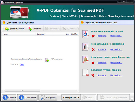 A-PDF Scan Optimizer - предоставляет быстрый способ для пакетной оптимизации отсканированных документов PDF. Программа поможет вам исправить "косые" отсканированные изображения, преобразовывать отсканированные изображения в черно-белый или серый цвет, а также отдекорировать изображения и удалять неиспользуемые пустые страницы. A-PDF Scan Optimizer открывает файл PDF и автоматически проверяет наличие смещенных изображений, а затем корректирует перекос с помощью специального алгоритма.
