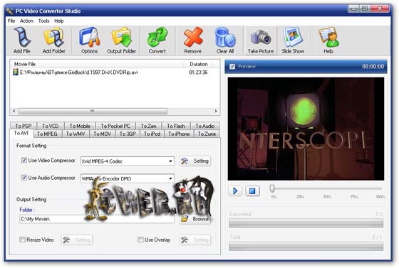 Power Video Converter - конвертер между популярными видео форматами. Имеется поддержка AVI, DivX, XviD, MPEG-4, MPEG1, MPEG2, VCD, SVCD, DVD, WMV, ASF, DAT, VOB форматов, пакетный режим конвертирования, высочайшая скорость конвертирования, поддержка PAL, NTSC видео, нарезка видео на фрагменты (ролики) по выбранному размеру или по временным позициям в встроенном проигрывателе, соединение фрагментов в один большой видео файл, извлечение аудио из видео и сохранение в MP3, WAV, WMA форматы, извлечение фрейма или разложение видео на последовательность BMP картинок, создание или загрузка WMV профиля, простой и удобный интерфейс, выбор и настройка кодеков, настройка параметров конвертирования, низкие системные и аппаратные требования.