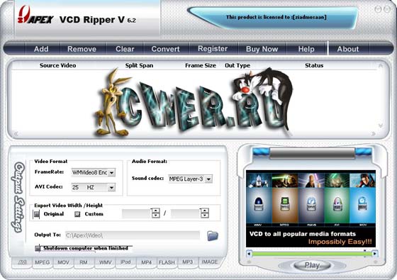 Apex VCD Ripper конвертирует VCD в любой видео формат, который Вам необходим, он используется для выполнения всех ваших требований в преобразовании видео файлов. Поддерживает конвертирование Ваших любимых фильмов из vcd в AVI, MPEG, VCD, DVD, MOV, RM, RMVB, WMV , ASF, Ipod, PSP, 3GP, Xbox, PPC, PMP, Flash SWF, Flash FLV, Youtube FLV, MP3 Audio, WMA аудио, WAV Audio, MP2, GIF анимация и GIF, BMP EPS, JPG, PCX, PSD, PDF, TIFF, WMF, EMF, PNG, J2K Picture форматов.