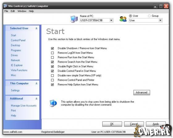 Win Control - программа, с помощью которой Вы сможете не только задать право доступа для каждого пользователя, но и защищать рабочий стол Windows от несанкционированного использования. Также вы сможете задать привилегии доступа к функциям системы для каждого пользователя или устранить удаленные / перемещенные ссылки, нелицензионные копии программ, неавторизированные заставки и многое другое в системах Windows 2000, NT и Windows XP.